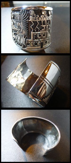 ものすごく綺麗なオーバレイでカチーナをデザインした、ホピ族のバングルになります。