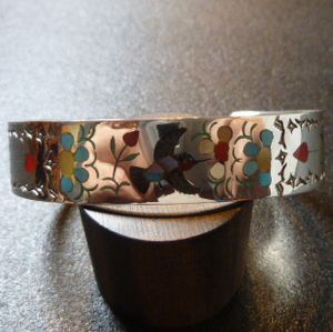 ものすごく綺麗なハミングバード&フラワーがインレイされた、ズニ族のバングルになります。