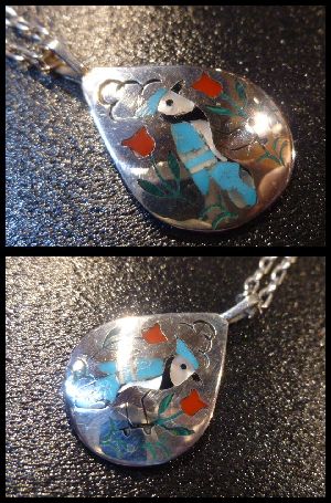 可愛らしいブルージェイがインレイされた、ズニ族のペンダントトップになります。