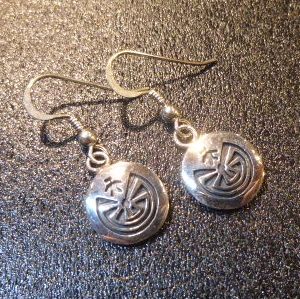 見事なオーバレイ&個性あるデザインが綺麗な、ホピ族のぶら下がり(ダングル)フックピアスになります。