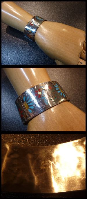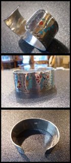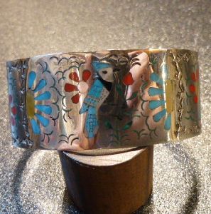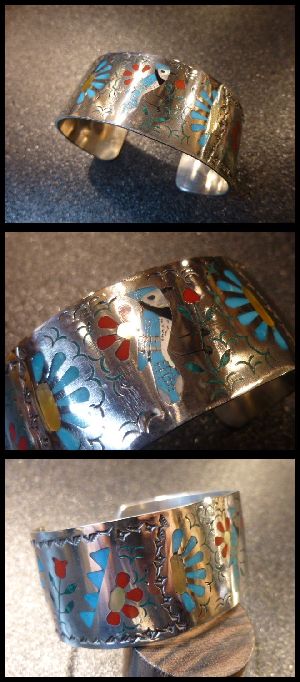 ものすごく綺麗なブルージェイ&フラワーがインレイされた、ズニ族のバングルになります。