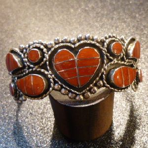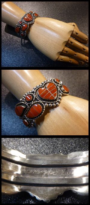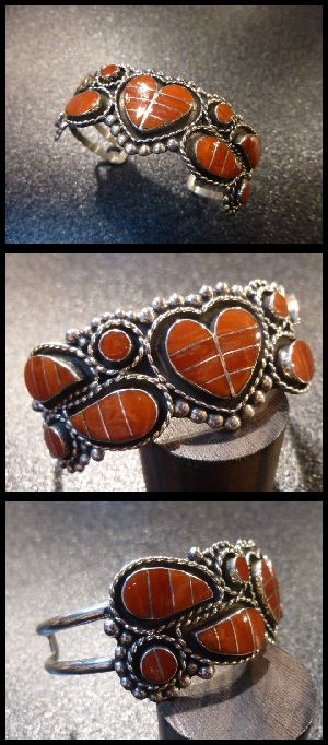 色鮮やかなコーラルインレイでフラワーをモチーフにした、ズニ族のバングルになります。