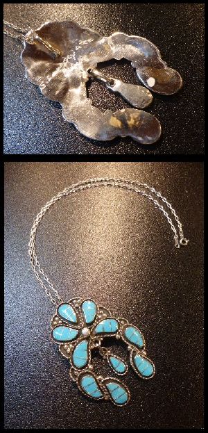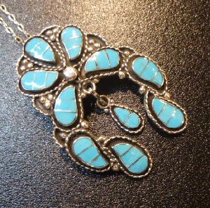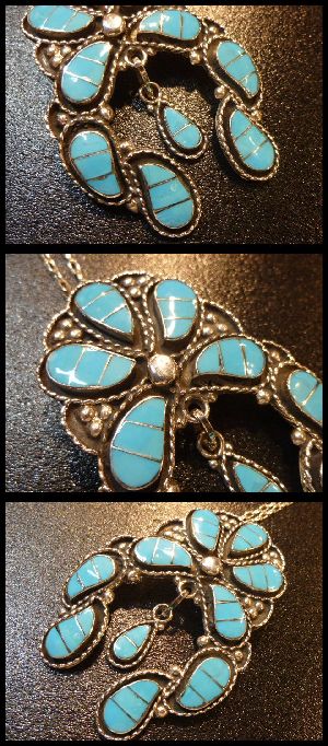 色鮮やかなターコイズインレイでフラワーをモチーフにした、ズニ族のナジャペンダントトップになります。
